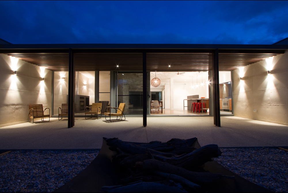 Rammed limestone walls are used to screen the building from western sun and strong winds. Concrete floors and cabinets trimmed with local hardwood are leavened with soft furnishings to offer form, function and comfort.