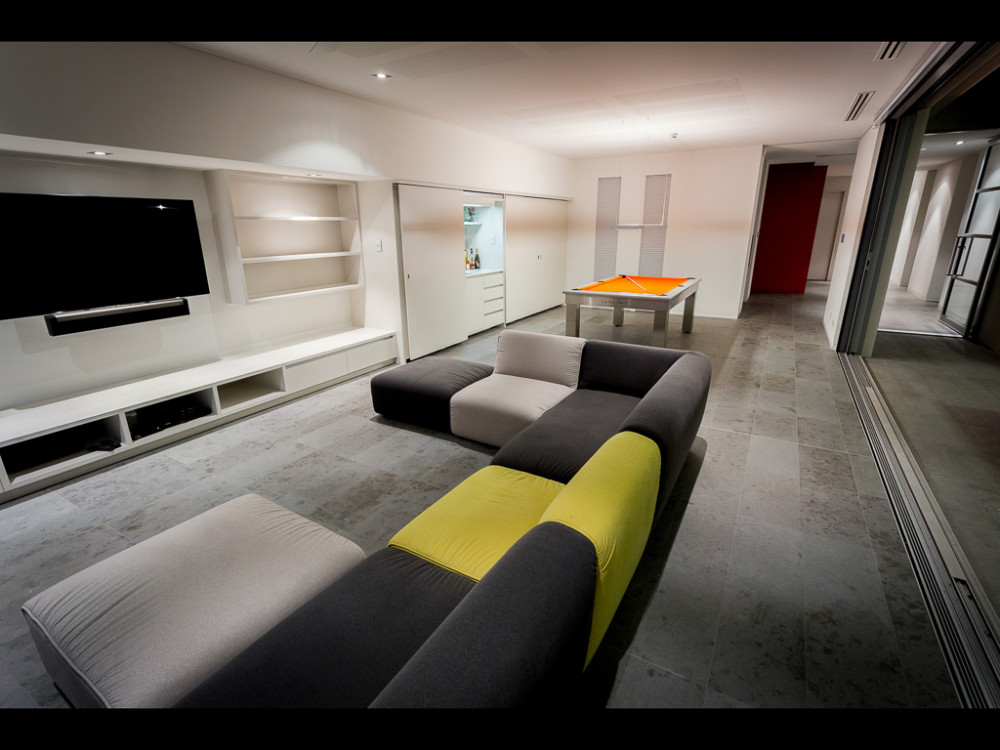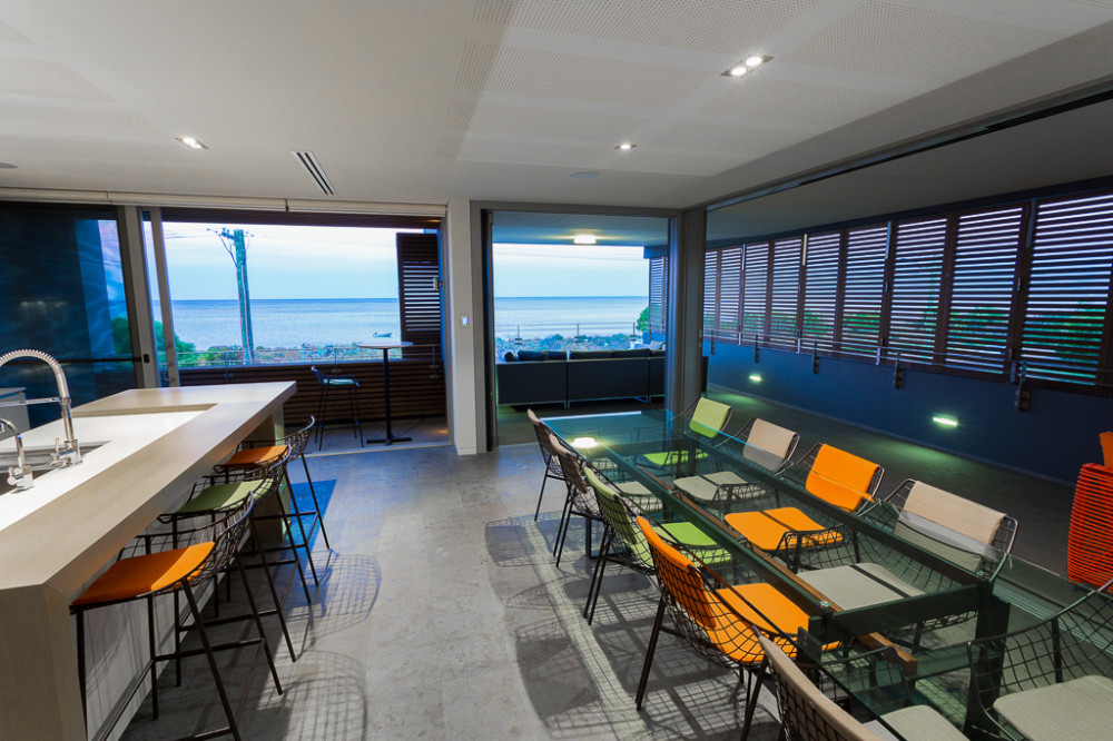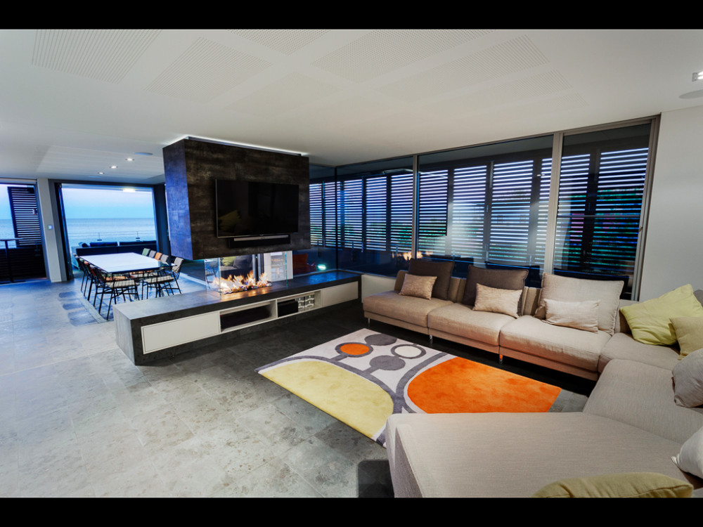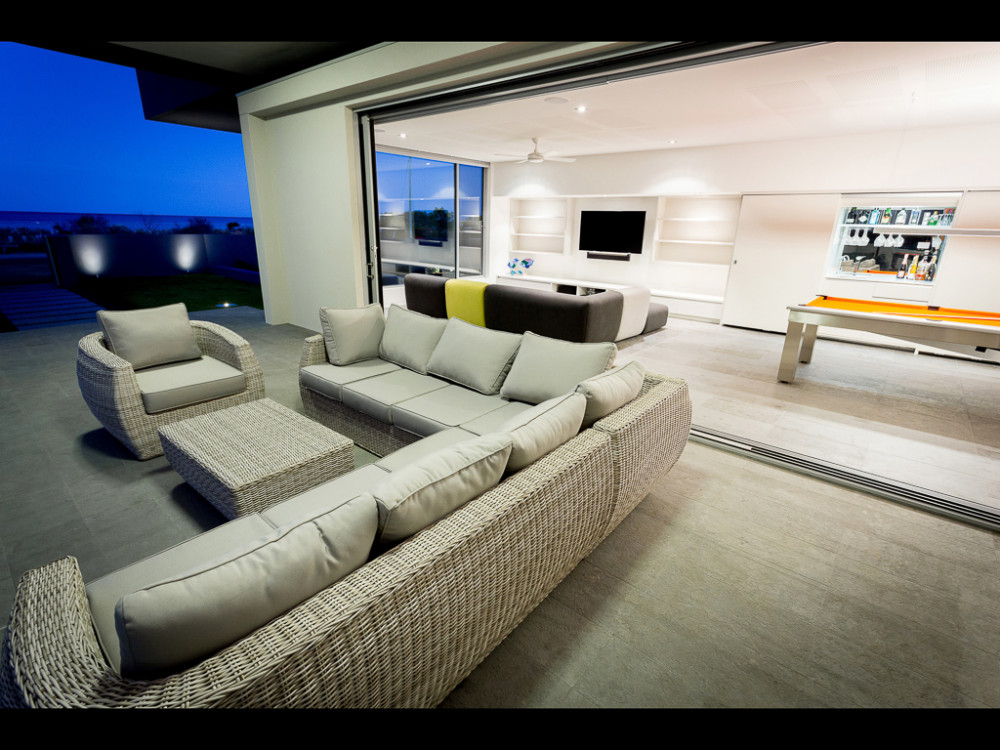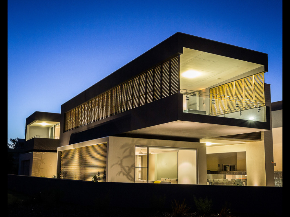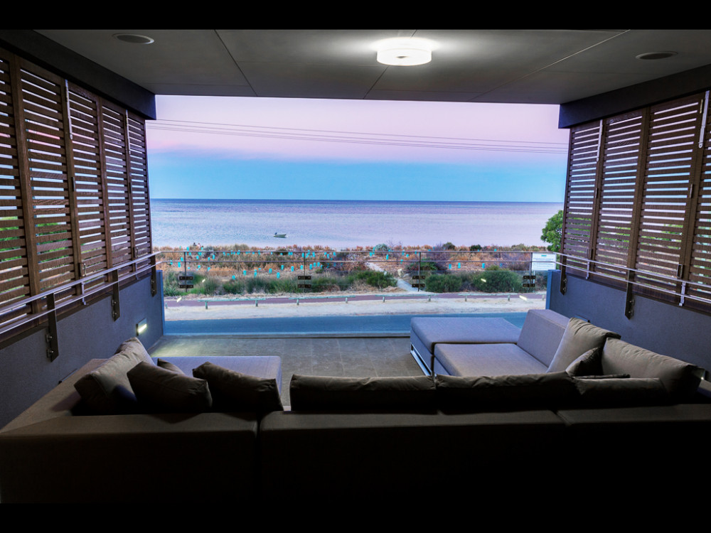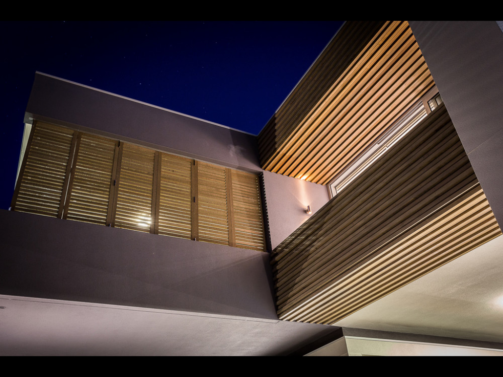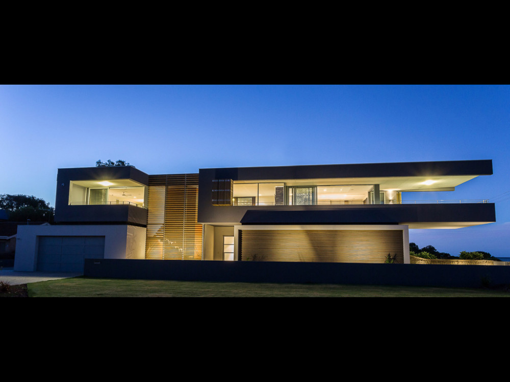 The cantilevered balcony puts you so close to the beach you can just about make the jump. Shutters clad with sawn timber battens adds a balance of texture to the rendered and glass façades.