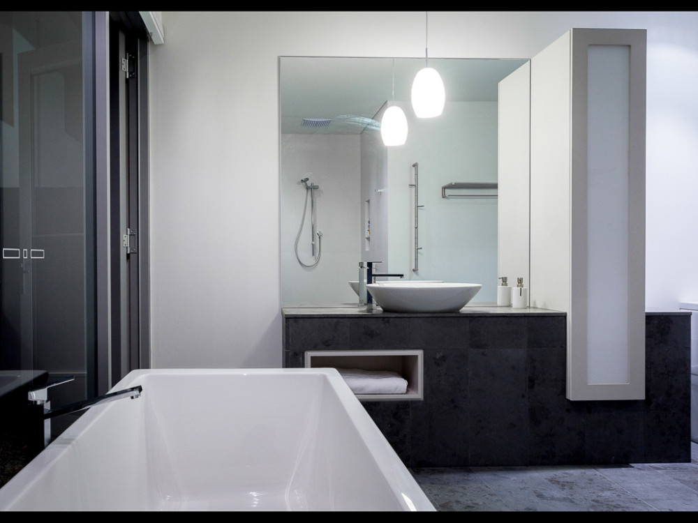 Black stone floors used throughout living spaces with carbonized oak flooring and timber detail to compliment the stone. Simple and elegant bathrooms that combine matt white with additional use of the black stone.