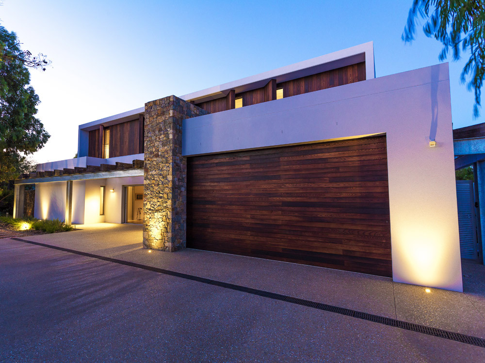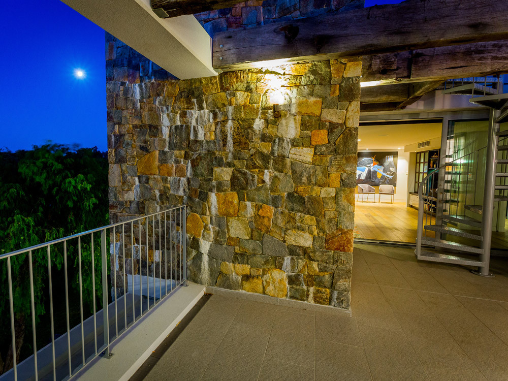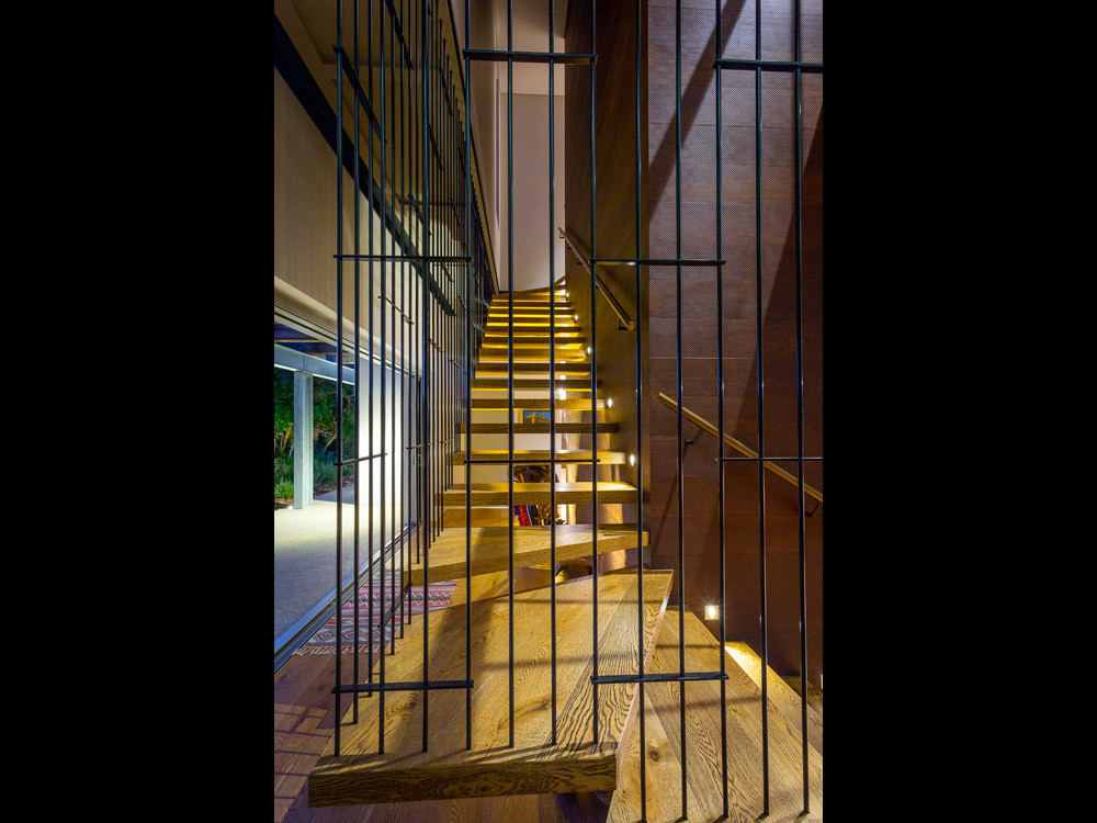 Stone, recycled timber beams and timber cladding dominate the material pallet of this exciting beach front home.