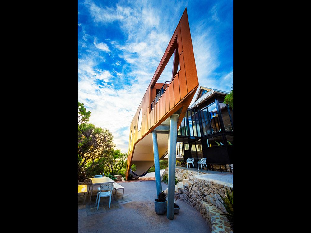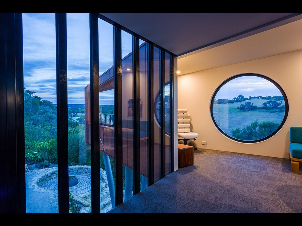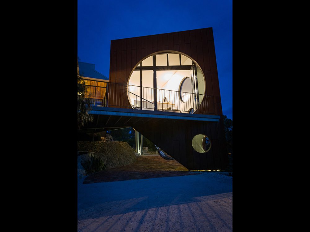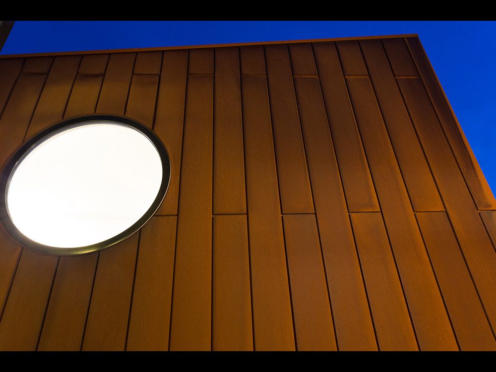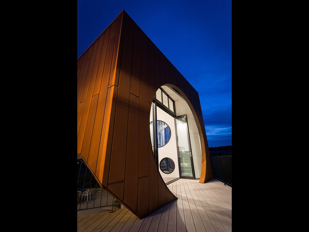 A striking angular form in stark contrast to the soft landscaping and traditional style of the existing home. The exterior skin wrapped in corten steel that will change colour with the seasons and age. Specific views framed by porthole windows. The whole structure balanced on skewed columns, all adding to the interest and complexity of this addition.