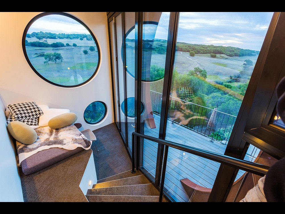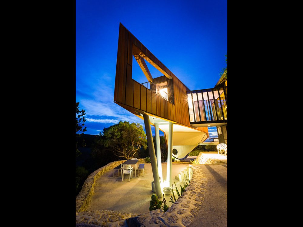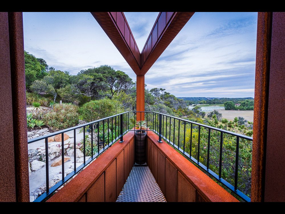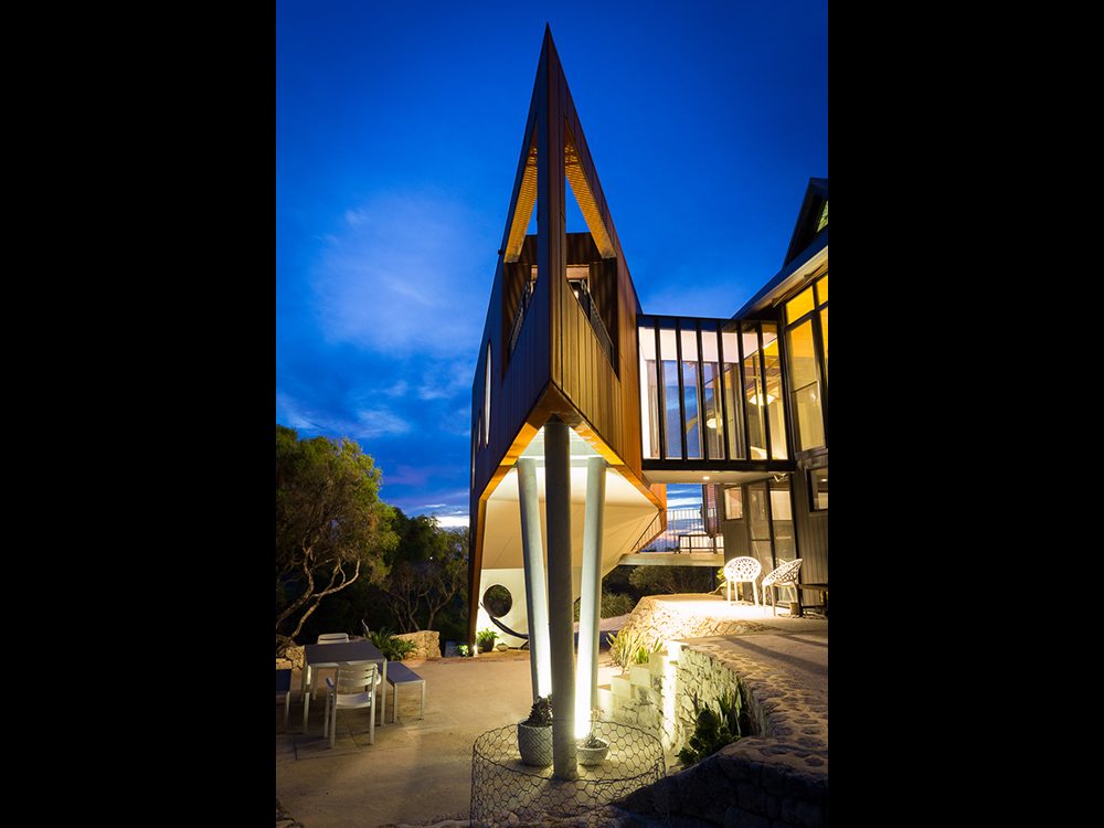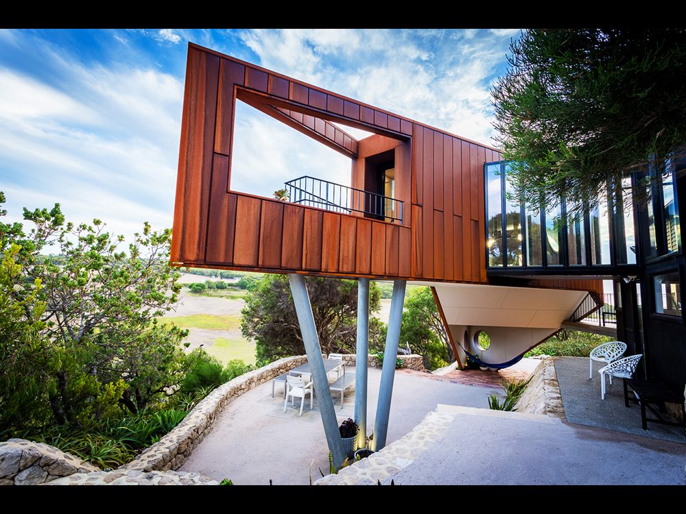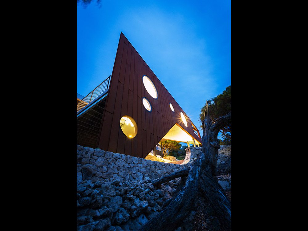 A striking angular form in stark contrast to the soft landscaping and traditional style of the existing home. The exterior skin wrapped in corten steel that will change colour with the seasons and age. Specific views framed by porthole windows. The whole structure balanced on skewed columns, all adding to the interest and complexity of this addition.